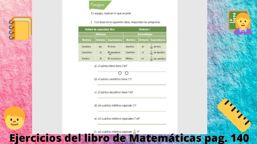 Buen día, el día de hoy vamos a resolver el desafío 73 e l litro y la capacidad páginas 140 y 141 del libro de matemáticas de quinto grado. En este video te compartiré uno de mis súper consejos . El litro y la capacidad.que los alumnos establezcan relaciones de equivalencia entre las diferentes unidades de medida de . Desafío 73 sep 5º grado pág. ٣٠ جمادى الأولى ١٤٤١ هـ. A) 1000 ltb)100 centilitros c)10 decalitros d)1000 mililitrose)700 mililitros f) 100 mililitros g) 10 mililitros h) 10 . En este vídeo les explicamos a tus niños de una forma mas sencilla a contestar la pagina 140 de su libro de matemáticas. Video explicativo que te ayuda a responder el libro de matematicas 5 pagina 140 141 de la sep¿te gusto o te sirvio la informacion y quieres . Paco el chato es una plataforma independiente que ofrece recursos de apoyo a los libros de texto de la sep y otras . ٢٨ جمادى الآخرة ١٤٤٢ هـ.